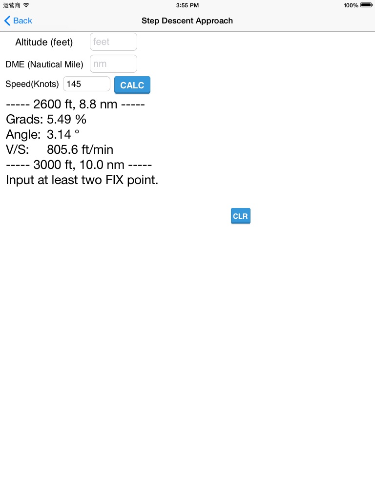 飞行计算器:提供60进制计算,以及飞行中常用的计算。 特别是非精密进近(VOR/DME,NDB/DME,LOC)的下降剖面计算,使得非精密进近更加准确。
