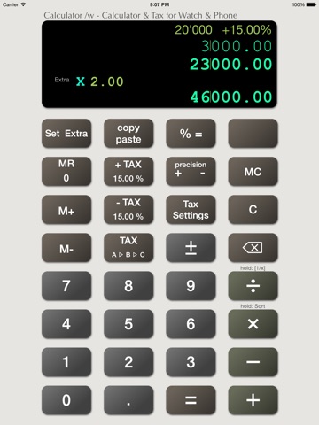 On the watch only a portion of the calculator is visible at once. To reach all elements please scroll between the upper and the lower parts of the calculator. Additional pages make it possible to perform further actions.
