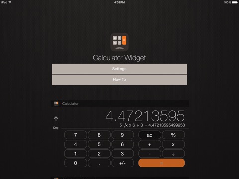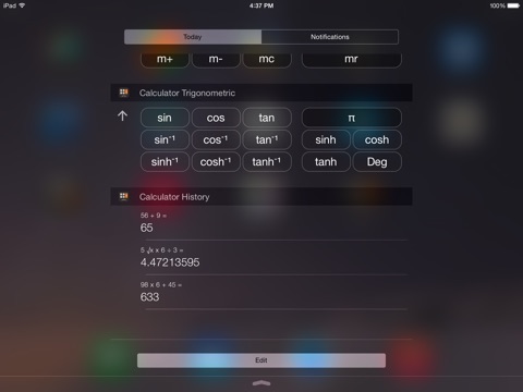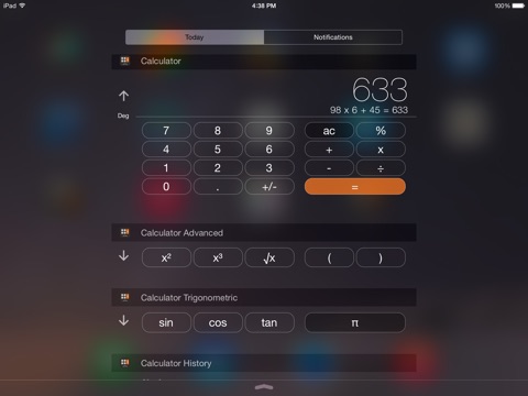 Calculator for iPad makes fully use of the new iOS capabilities and puts a normal, scientific and a trigonometric calculator right in your notification center!