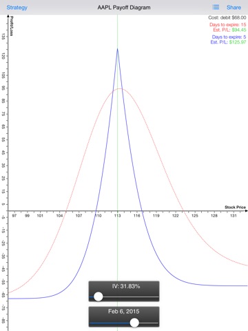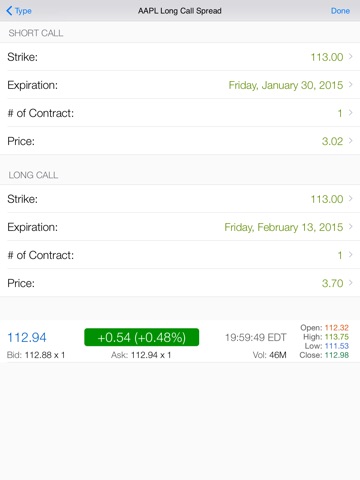This app is very powerful in helping you make right decisions in options trading. It helps you watch the market through visualized market information and visualize your risk/reward of the option strategy. Using the Black-Scholes model to price options, Calendar Spread Pro draws / visualizes the payoff of options strategies and clearly presents how time decay impacts strategies. Play with the IV Slider and the Date Slider to watch the impact and evaluate your strategy further more. Also enjoy the dynamic, lightening fast, near Real-Time options chains.