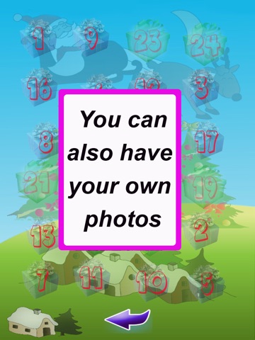 You can view the 24 animals provided in the app, but also create your own calendar with your photos and your associated sounds. Build your own calendar by creating your own enigma that will define the final gift.
