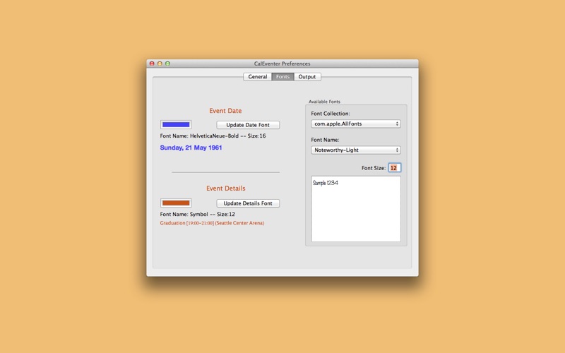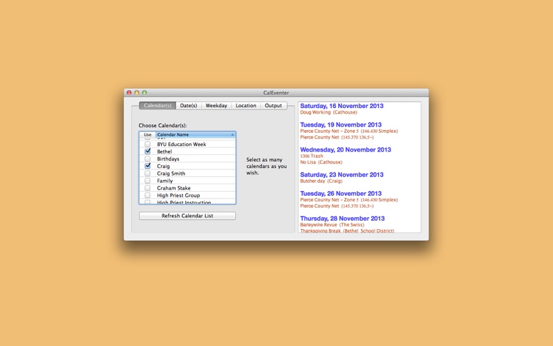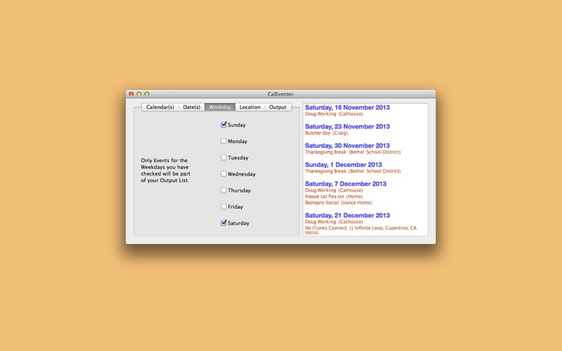 Calendar and Event data is drawn directly from the Calendar Store database, therefore, Calendar need not be running to use this application. All Events, including recurring Events, for the specified date range are selected and incorporated into your final output.