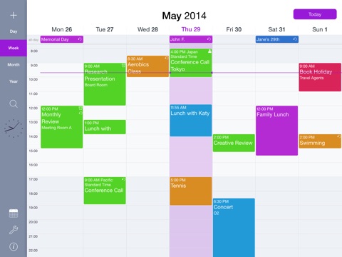 • Time Zone support makes scheduling international meetings a breeze. When enabled, an event will display its time, date and time zone if different to the current system time zone. So you can easily see that your 9:00am conference call from the UK will occur at 5:00pm in Japan.