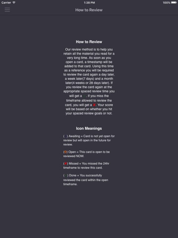 We have heavily researched many learning studies done by famous authors such as Hermann Ebbinghaus, Sebastian Leitner(Leitner System), Paul Pimsleur, A.W. Melton, Thomas Landauer, Robert A. Bjork, C. A. Mace & H. F. Spitzer from which we extracted the best concepts to ultimately create this technology focused App. Our brilliant team of developers built this proprietary piece of technology which keeps track of when a particular flashcard was reviewed, prompts users to review it again 1 day later, a week later(7 days) & a month later(28 days so 4 weeks). Spacing reviews in this manner insures each flashcard will be learned at least 4 times which almost guarantees the material will be retained in the memory forever.