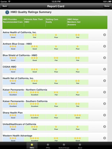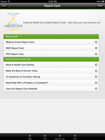 California Health Care Quality Report Card is a one stop shop to look at the quality ratings on medical groups, HMOs and PPOs in California.