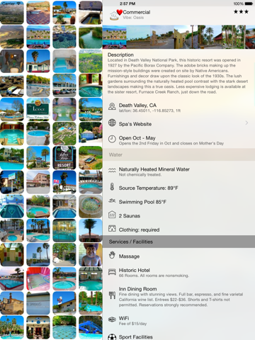 Find hot springs and mineral spas using this electronic guidebook. With a focus on naturally heated mineral water, this guide will lead you to road-side soaks, spiritual retreats, commercial spas and natural springs in the deep wilderness. For the adventurous types, weve also included hundreds of unreviewed thermal sites from government databases and other sources. Unlike a static book, this guide has links to hundreds of color pictures, review sites, videos and nearby attractions. By including map-based navigation, GPS-based distance and heading, as well as written directions, it is usable on and off-line and with or without a GPS.