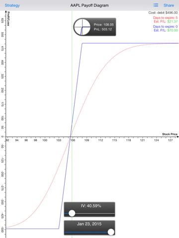 This app is very powerful in helping you make right decisions in options trading. It helps you watch the market through visualized market information and visualize your risk/reward of the option strategy. Using the Black-Scholes model to price options, Call Put Spread Free draws / visualizes the payoff of options strategies and clearly presents how time decay impacts strategies. Play with the IV Slider and the Date Slider to watch the impact and evaluate your strategy further more. Also enjoy the dynamic, lightening fast, near Real-Time options chains.