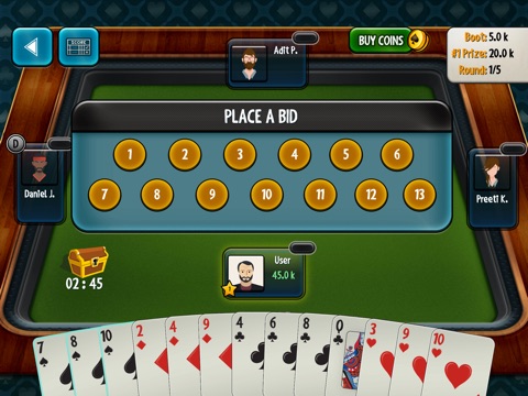 There will be five rounds of play or five deals in a game. First dealer will be chosen randomly and after that, the turn to deal rotates Anticlockwise from first dealer. Dealer will deal all 52 cards to four players i.e. 13 each. After the completion of each deal, player left to dealer will Place a Bid - which is a number of hands( or tricks) he/she thinks will probably going to capture, and call moves again in Anticlockwise to next player until all 4 players finished calling.