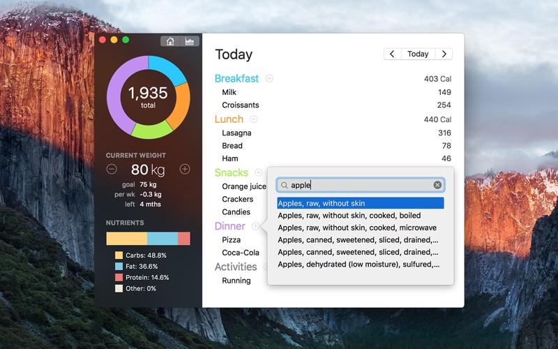 Carina e semplice da usare, ma fin troppo: peccato non abbia un database degli alimenti! Bisogna inserire i valori nutrizionali manualmente (a onor del vero cè un menú che rimanda ad un sito per trovarli ma vale solo per gli alimenti Americani). Speriamo in un miglioramento in questo senso.