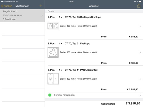 Kalkulationsprogramm für Fenster & Haustüren in PVC und ALU, SchücoSysteme Zuschlag und Rabattierung möglich, daher auch für Händler geeignet. Farbauswahl möglich, direkte Angebotserstellung, per Email oder Ausdruck.