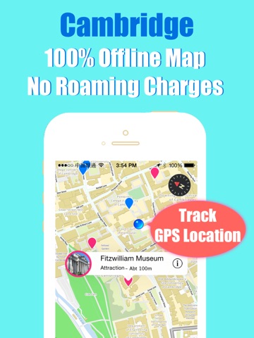 Cambridge Travel Guide is your ultimate oversea travel buddy. Offline GPS locates and tracks your position in Cambridge at real time. The most important feature is: NO 3G/4G, NO Wifi and absolutely NO Network Data needed. 100% offline. This app provides you augmented reality direction guide, offline city map with all the metro/train stations, metro route search, must-go tourist attractions (red pin) plus other hundreds of POI -Point of Interests (blue pins). Save you expensive roaming charges while you are traveling abroad.