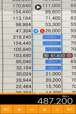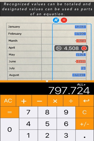 Values needed when making a calculation can be acquired through the camera, eliminating the trouble of having to input digits several times. The app can be used in many convenient ways, such as by totaling all values in one part of a document, etc.