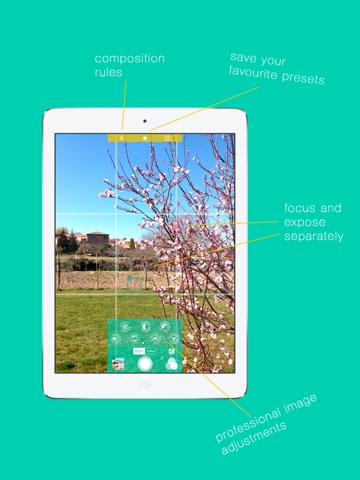 - Adjust more than ten image parameters just like in a professional camera (bright, contrast, saturation, sharpness...). Composition rules are also included so your photos and videos come out perfect.