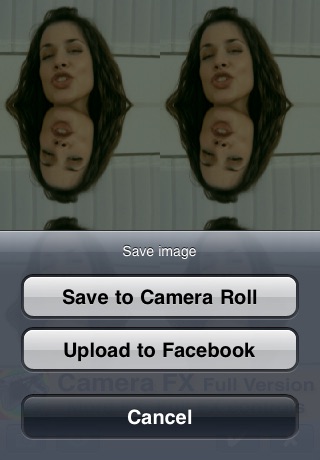 Camera FX Lite features most of the effects found in Camera FX, but does not allow the individual effects to be controlled. Simply tap the screen to shuffle the current effect, then tap the camera icon to save the current image. Photos can be saved to your camera roll or uploaded to Facebook.