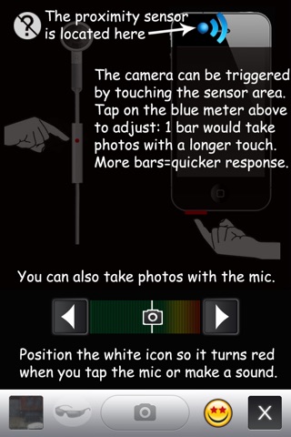 Photos can be taken with any physical touch on the mic: Tapping, swiping, flicking or rubbing the mic or proximity sensor will all result in audio levels that are detected by the application. If the iPhone is held in landscape mode, sliding a finger along the frame on the home-button side is just one of many ways to trigger a photograph. Photos can also be captured with verbal or non-verbal sounds. Blowing into the mic, whistling, clapping, snapping fingers or verbal queues like "cheese" can all be used to activate the camera.