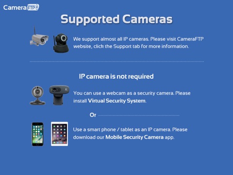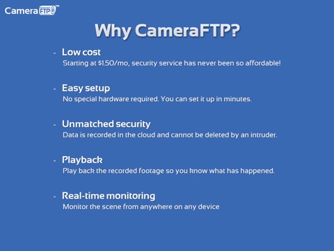 CameraFTP has far better features than regular security services. It is very easy to setup. You can use webcam or smartphone as IP camera, saving the cost of buying an IP camera. Your footage is uploaded to CameraFTPs secure data center. It is more secure than a regular IP camera or CCTV DVR system that records data locally and can be destroyed by an intruder.