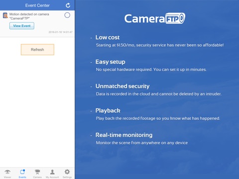 This is the viewer app for CameraFTP cloud surveillance and recording service. You can view / play back cameras in your account, or view shared / public cameras. CameraFTP.com offers a revolutionary security and monitoring service for home and business. It is compatible with most IP cameras/NVRs. You can save camera/NVR cost by using CameraFTP Mobile Security Camera app or CameraFTP VSS software. With CameraFTP camera apps, the live view and 2-way video calling features are free. It is better than IP camera or Baby Monitor. CameraFTP also offers free trial and very limited cloud recording service for free. You can optionally order a low-cost cloud recording service starting at only $1.50-$2.50/camera/month.