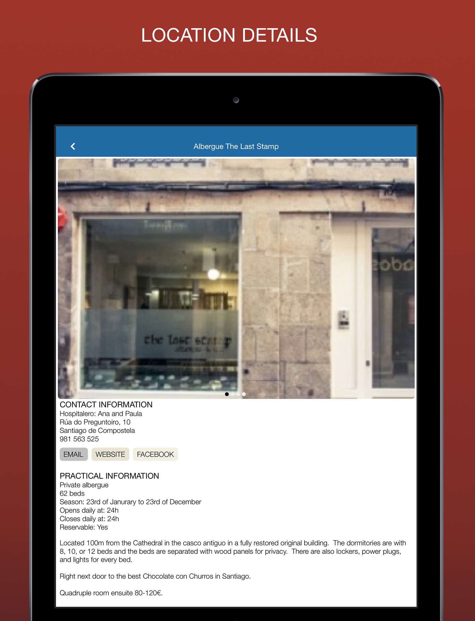 Comments: Albergue closed early for the season? Have a restaurant that you want to share, or perhaps one to warn others about? Every location in the app gives you the opportunity to leave a comment and to read the comments left by others. No registration necessary.