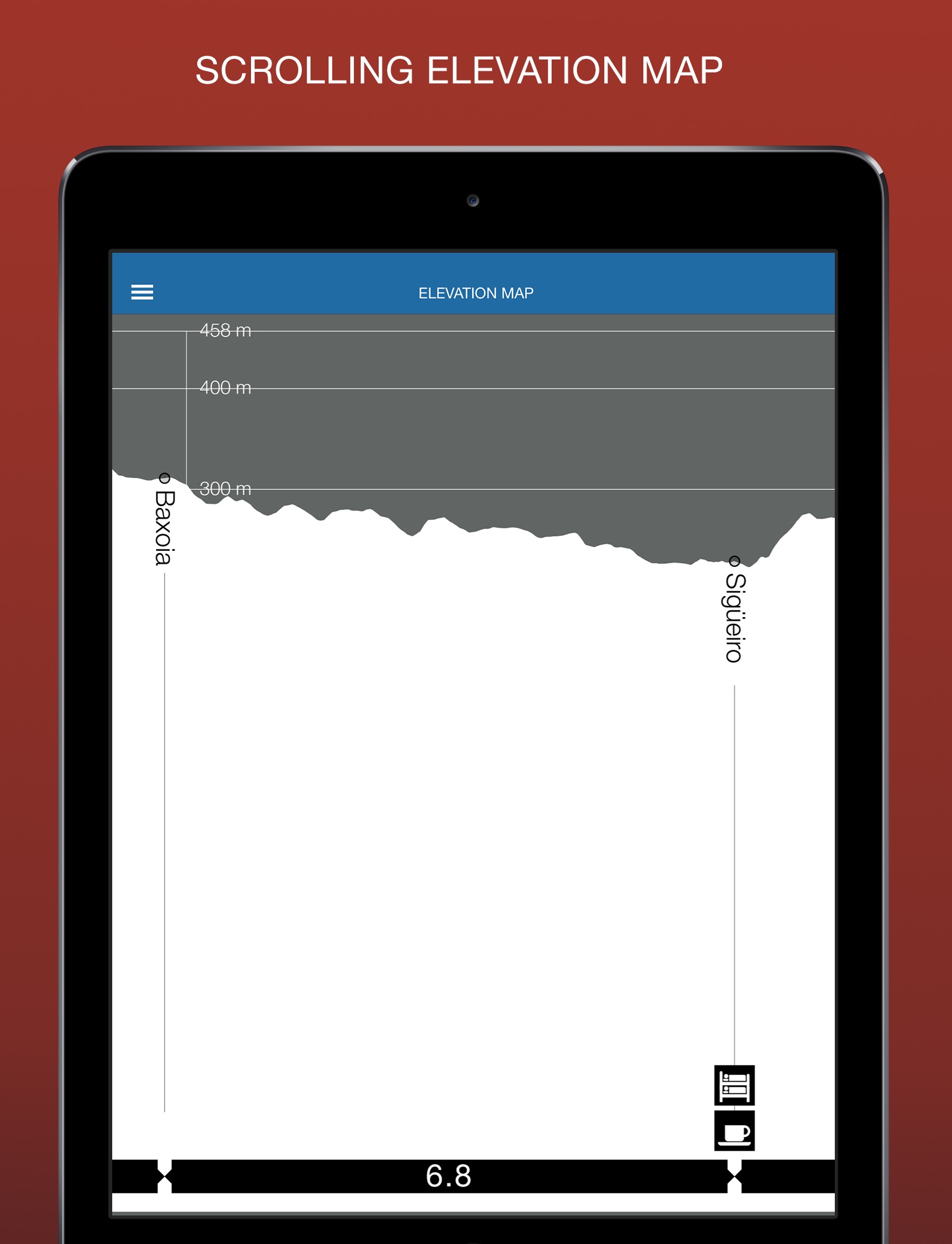 Scrollable Elevation Map: This one is hard to show with just a screenshot, but the elevation that appears at the top of every city page scrolls East to West. One complete elevation, from St. Jean Pied de Port to Santiago, uninterrupted by page folds.