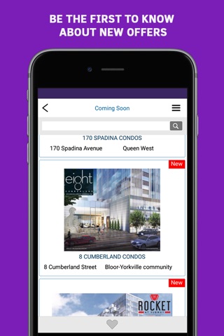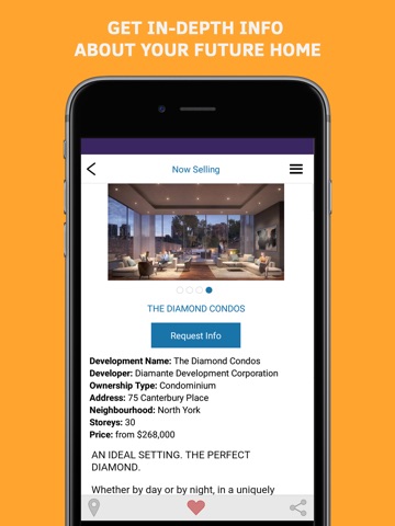 Now you can search and discover best condos on the go. Explore development projects info, floor plans, amenities and more. Share and save your favorite condos with friends and family via email or social media. Get notifications to be the first to learn about new projects open for registration.