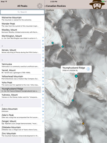 -If youre interested in a particular peak, theres an index with the names of all 1560 peaks in the Rockies. Tap on the one youre interested in and youll see where its located with respect to your location. Youll also see the distance to the peak and its bearing.