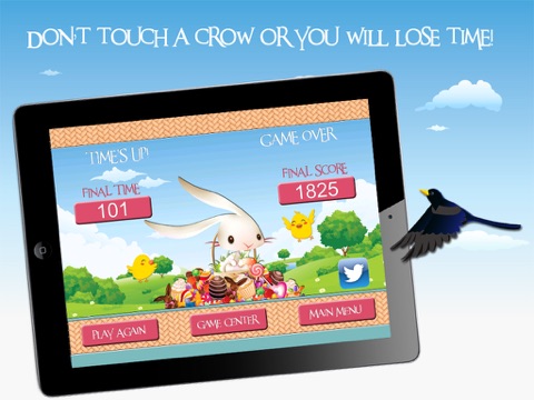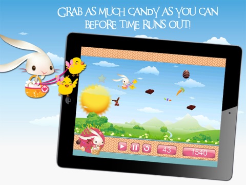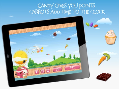 Grab as much candy as you can before the time runs out! Use the star to move the bunny to collect candy and delicious carrots before they are lost. Candy gives you points. Carrots add time to the clock. Be careful NOT to touch a crow or you will lose time!