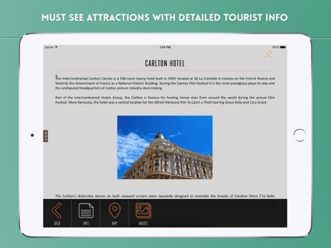 Tourist info for must see attractions such as Promenade de la Croisette, Palais des Festivals et des Congrès, Carlton Hotel, Majestic, Hôtel Martinez, Lérins Islands, Lérins Abbey, Monaco, Nice, Côte d’Azur, among others.