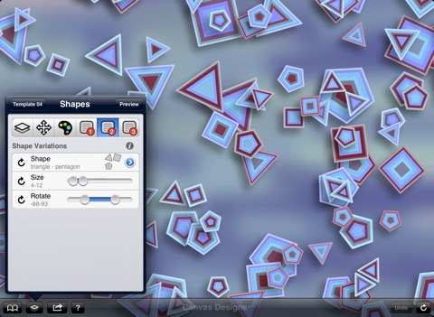 A key-feature of Canvas Designer is property randomization. Every property can accept from-to values resulting in different design variations every time you tap refresh.