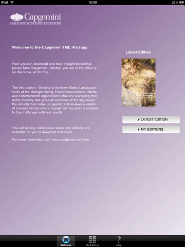 The Capgemini TME application allows you to download and read thought leadership pieces from the Capgemini Telecom, Media and Entertainment division. /