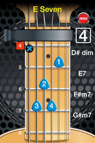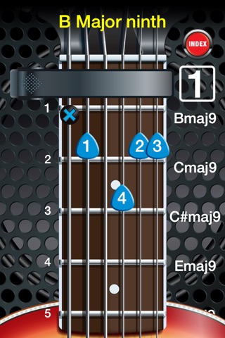 The capo can be swiped up or down to navigate to the next fret position, from the open position (no capo) all the way up to the ninth fret. Chords are selected by choosing a chord category from the main index and then the individual name from the chords listed in the scrolling menu on the right.