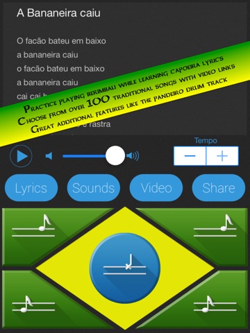 Learn Capoeira lyrics and practice berimbau anywhere with Capoeira Music Maker! This app includes controls to play the berimbau through your device while displaying lyrics from the built-in library of traditional Capoeira songs. The Capoeira video button is also a powerful feature: it takes you directly to a YouTube video for the currently selected song.