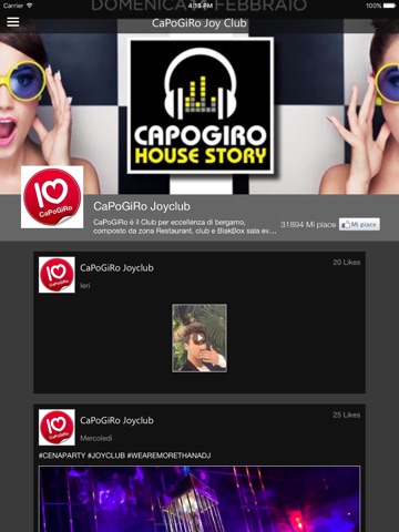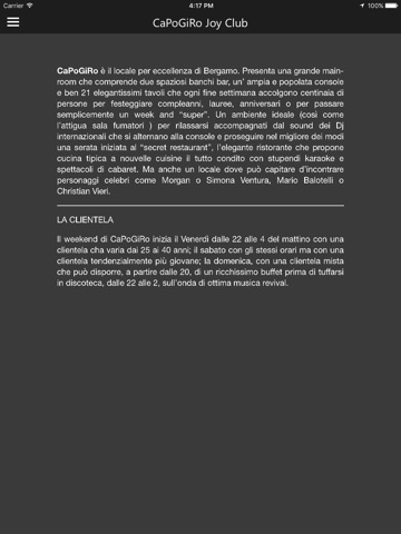 CaPoGiRo è il locale per eccellenza di Bergamo. Presenta una grande main-room che comprende due spaziosi banchi bar, un’ ampia e popolata console e ben 21 elegantissimi tavoli che ogni fine settimana accolgono centinaia di persone per festeggiare compleanni, lauree, anniversari o per passare semplicemente un week and “super”. Un ambiente ideale (così come l’attigua sala fumatori ) per rilassarsi accompagnati dal sound dei Dj internazionali che si alternano alla console e proseguire nel migliore dei modi una serata iniziata al “secret restaurant”, l’elegante ristorante che propone cucina tipica a nouvelle cuisine il tutto condito con stupendi karaoke e spettacoli di cabaret. Ma anche un locale dove può capitare d’incontrare personaggi celebri come Morgan o Simona Ventura, Mario Balotelli o Christian Vieri.