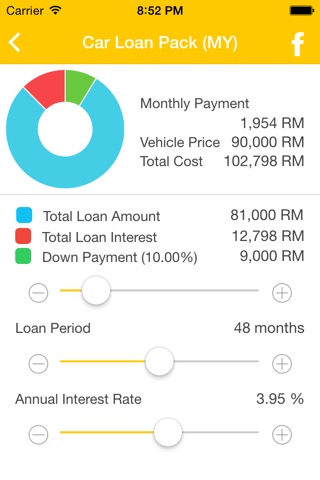 Car Loan Pack is a simple car loan calculator, designed for automotive loan calculation available in Indonesia, Malaysia, Philippines, Singapore and Thailand. Just enter vehicle price, down payment amount, interest rate per year then select term in months and tap on the “Calculate” button to get the result. You can also adjust down payment amount, term in months, and interest rate on the result page to change the result instantly.