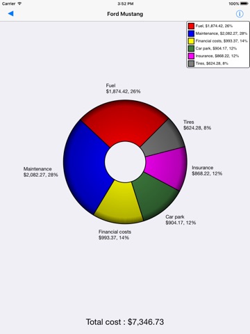 The application updates the overview and detailed statistics of your expenses: cost per spending category, cost per kilometer or daily cost. Non financial data, such as the change in mileage and average fuel consumption can also be calculated, and displayed in brief or in detail.