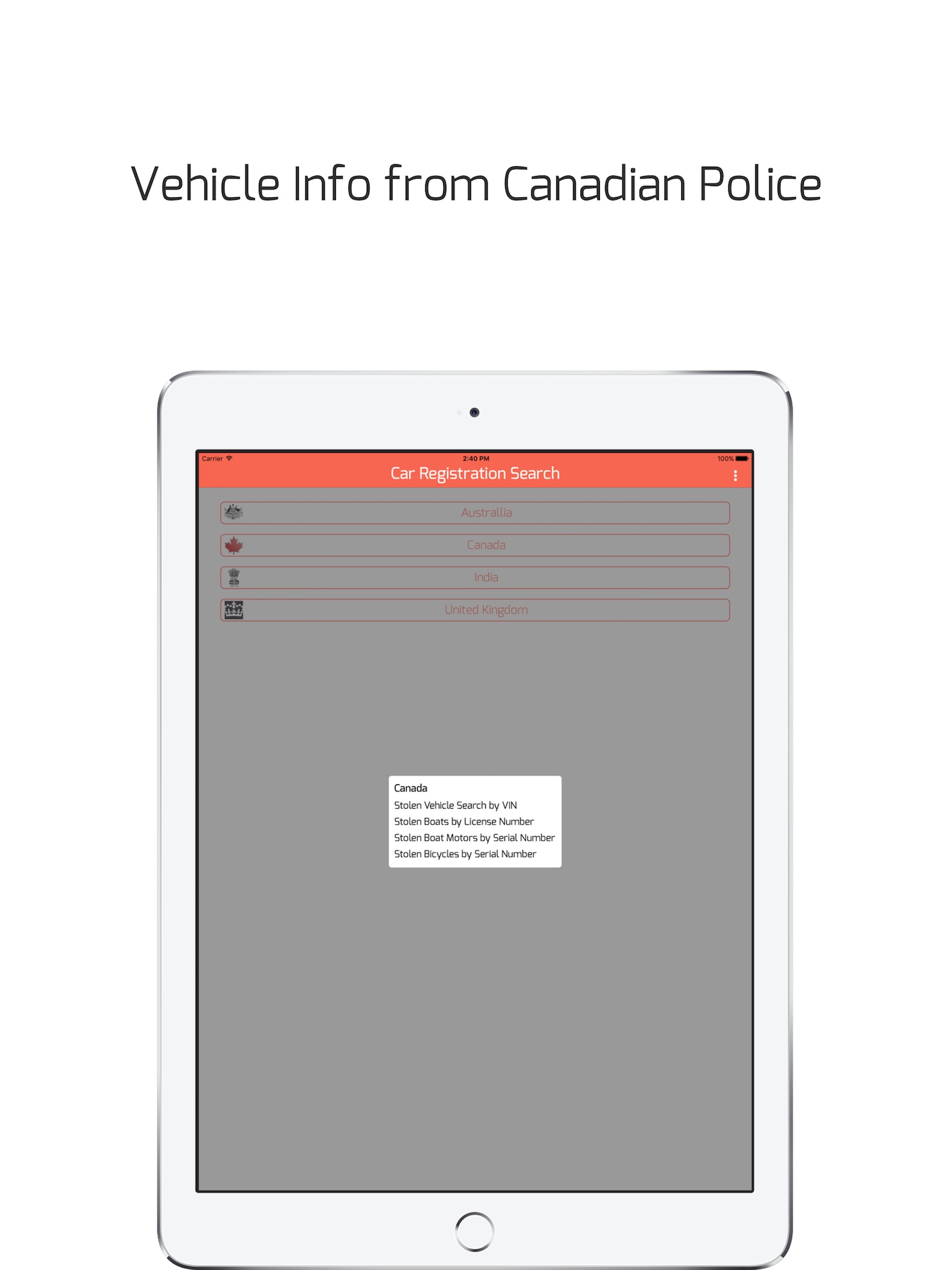 Check the vehicle registration details of - United Kingdom, Australia, Canada (stolen) and India (selective states).