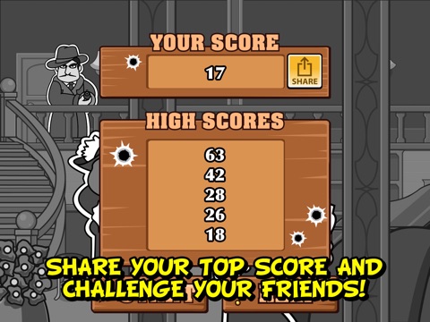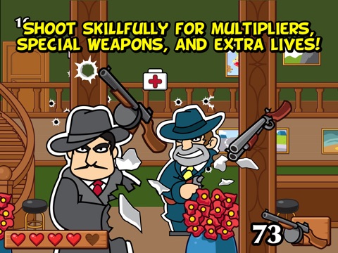 Tap the screen to shoot those silk-hatted hoodlums. Hit the target center on to bump off the villain immediately. Pick up special firearms from some thugs by hitting their weapon. Cardboard Crooks love their hats. Shooting it off will make them come after you harder.