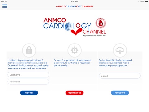 L’app permette di accedere al servizio “ANMCO CARDIOLOGY CHANNEL”, che offre accesso ad alcune risorse informative e di servizio con finalità di aggiornamento medico.