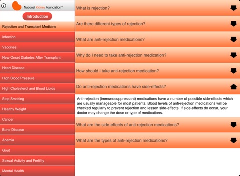 This app is a convenient way to learn how to stay healthy with a kidney transplant. It provides the answers to frequently asked questions about how and why it is important to follow all of the instructions and recommendations from your transplant team.
