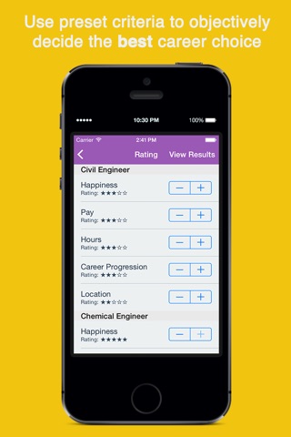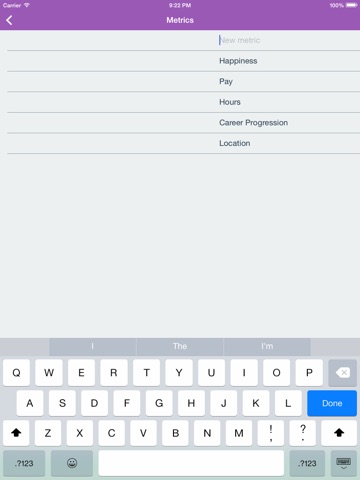 Career Decision Maker comes with predetermined metrics, but also allows you to add more metrics to rate your options. By determining the overall rating for each option, you can easily find out which option is the most desirable.
