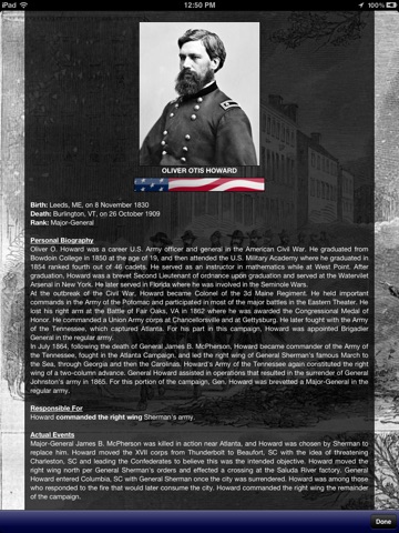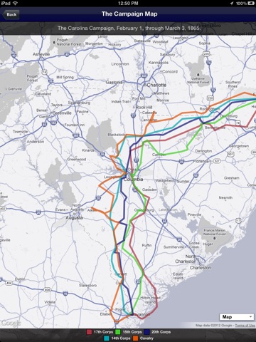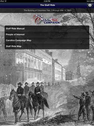 The Carolina Campaign App is an Army-developed app that supports the Warrant Officer Course held at the Adjutant General School, Fort Jackson, SC. The App provides students with an interactive historical survey of the Civil War Campaign known simply as the Carolina Campaign. Students are able to browse dynamic maps to view the historic campaign progress through the state of South Carolina into Fayetteville, North Carolina as it was commanded by General William Tecumsah Sherman in January of 1865. The Army’s path has be reconstructed with the aid of era maps, Civil War correspodence, and other primary sources. Students are additionally able to view the events and tactical movements that occurred during the infamous Burning of Columbia on February 17th, 1865.
