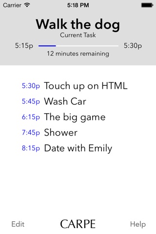 Carpe streamlines the process of planning out a chunk of time with an app that fits in the palm of your hand. Notifications, a progress bar, and a timeline then keep you on track. You will know what youre supposed to be doing, and how much longer you should be doing it. With Carpe, getting distracted will be harder than ever.
