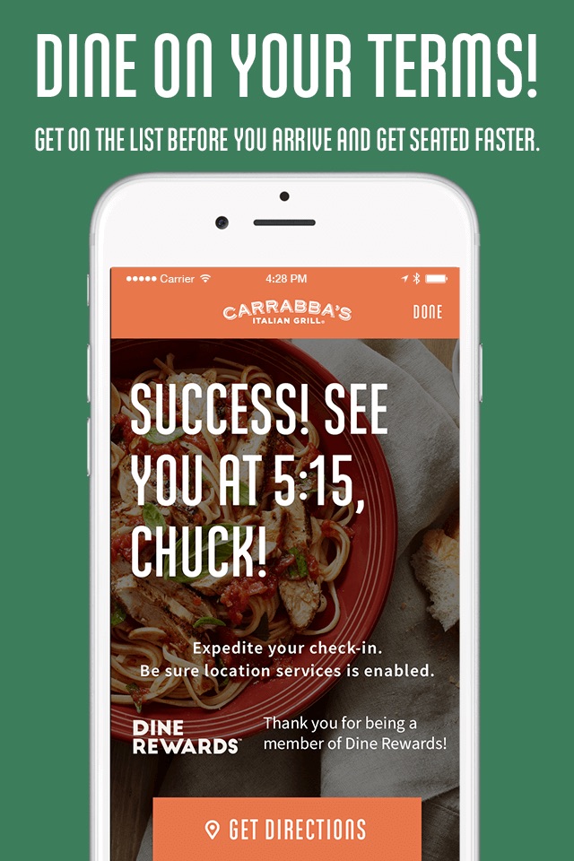 The Carrabbas App uses data encryption to protect your financial information and card data is never stored on Carrabba’s Italian Grill servers. The Carrabbas App also uses GPS to enhance the user experience by prompting you to check in when you arrive at the restaurant.