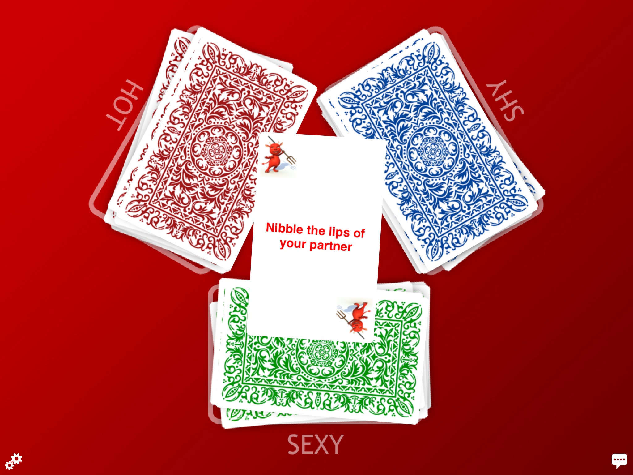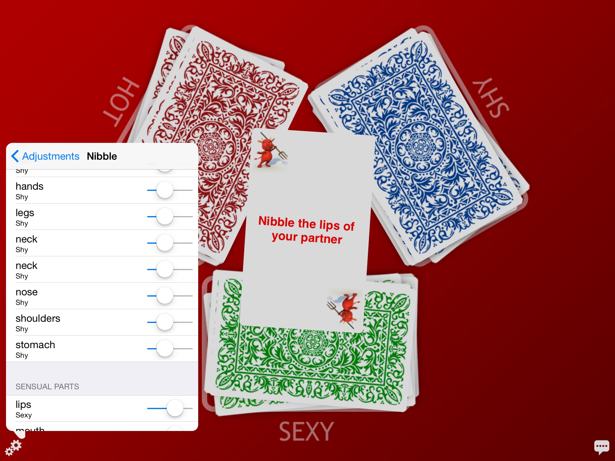 Des combinaisons plus logiques aurait pu être faite sans quon soit obligé de configurer le jeu pendant des heures!! (je ne me vois pas lécher du nutella ds les cheveux de ma copine!!) Il y a des bug lorsque lon configure a partir des "actions", en effet, tout ce quon enlève ou change de catégorie redevient comme avant. Il aurait été de bon ton que les tas de cartes "sépuisent" et ne soit pas infini avec un tirage au hasard. Car après avoir tiré 4 fois la même action/zone sur 6 tirages on se lasse et lambiance retombe bien vite ds la chambre a coucher!! Une mise à jour serait la bien venue!!!!!