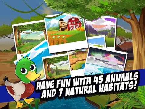 The app contains 45 animals, (domestic and wild), and teaches the animals name, sound, habitat, appearance, and type (mammal, amphibian, etc), all with some unique, original artwork and music.