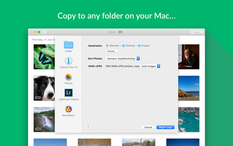With Cascable Transfer, you can wirelessly preview and copy JPEG and RAW* photos to your Photos library, Lightroom catalog, Capture One Pro catalog, or anywhere else on your Mac either directly or using the batch image-processing tool Retrobatch.