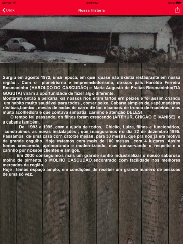 Um pouco da nossa historia Como surgiu o Cascudao? Surgiu em agosto 1972, uma epoca, em que quase nao existia restaurante em nossa regiao . Com o pioneirismo e empreendedorismo, nossos pais Haroldo Ferreira Rosmaninho (HAROLDO DO CASCUDAO) e Maria Augusta de Freitas Rosmaninho(TIA GUGUTA) viram a oportunidade de fazer algo diferente. Montaram entao a peixaria, os nossos rios eram fartos em peixes e foi assim criando um habito muito saudavel para todos , comer peixe. Cabana simples de sape,madeiras rusticas,bambu , mesas de rodas de carro de boi e bancos de tronco de madeiras, mas muito acolhedora e que contava simpatia, carinho e atencao DELES! O tempo foi passando, os filhos foram crescendo (ARTHUR, CHICAO E IVANISE) e a cabana tambem. De 1993 a 1995, com a ajuda de todos , Chicao, Luiza, filhos e funcionarios, construimos as novas instalacoes , que inauguramos no dia 22 de dezembro 1995. Passamos de uma casa com catorze mesas, para 30 mesas, que pra nos ja era motivo de grande orgulho. Hoje estamos com mais de 100 mesas com 4 lugares. Assim fomos crescendo, aprimorando e modernizando, mas conservando o respeito e o carinho por nossos clientes e amigos. Em 2000 conseguimos mais um grande sonho industrializar o nosso saboroso molho de pimenta, o MOLHO CASCUDAO,encontrado com facilidade nos melhores mercados da regiao. Hoje , temos espaco amplo, em condicoes de receber um grande numero de pessoas de uma so vez.