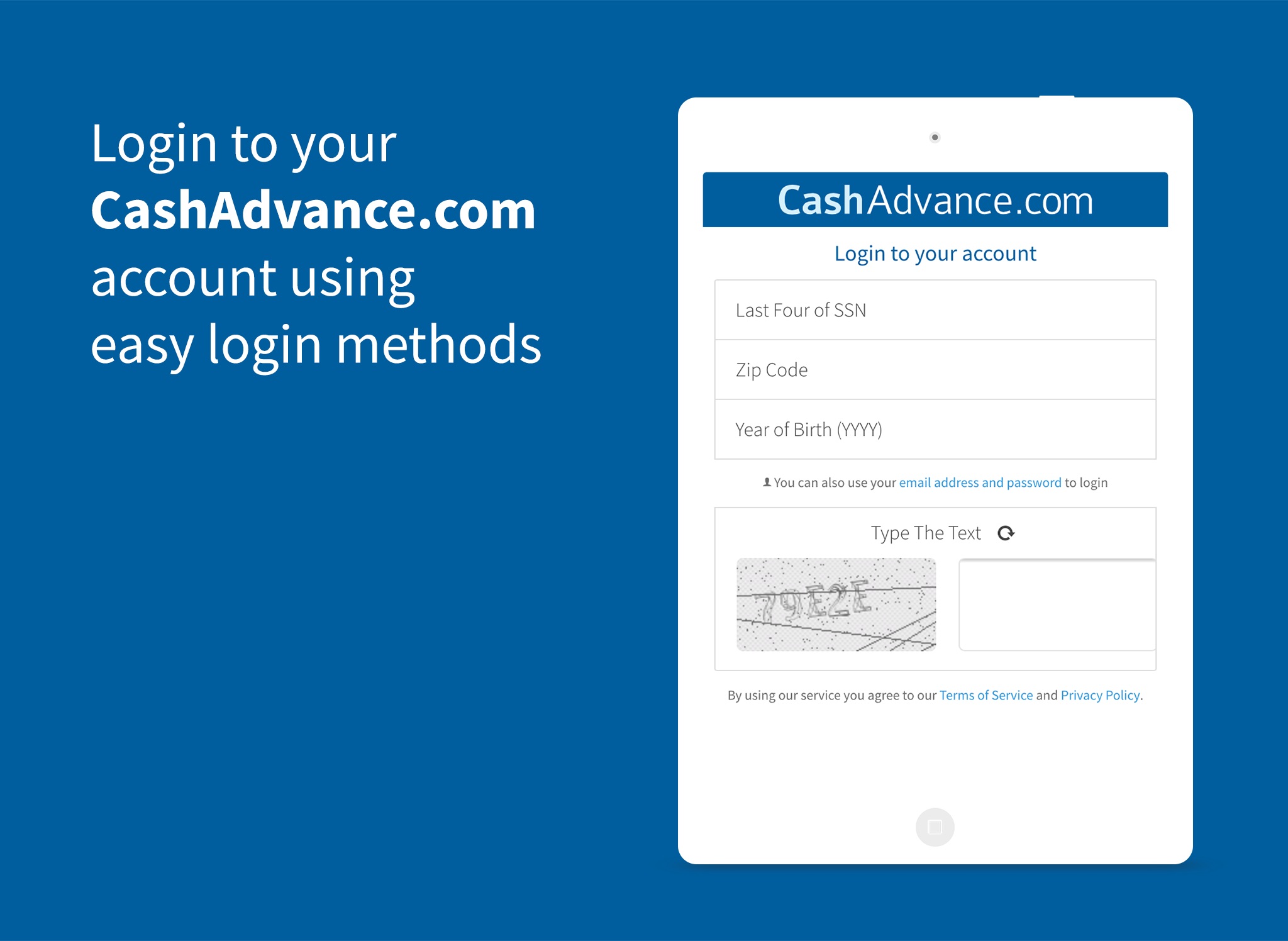 This user-friendly app now allows you to easily navigate features, request loan options, and access your account through any device - in the comfort of your own home, office, or even on-the-go. CashAdvance™ uses high-grade Verisign 256-bit SSL and is tested by Norton on a daily basis, ensuring a safe user experience.