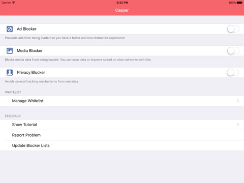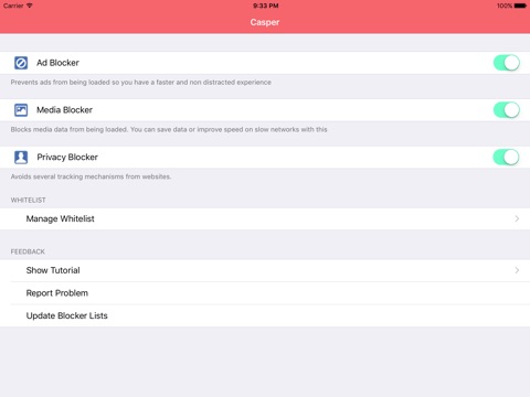Since the release of iOS 9, content blocking is possible and more robust than ever before. Casper anti-ads is created to remove all ads from your internet browser and give you a smooth and fast experience. Casper blocking mechanism makes it easy to block ads and tracking scripts by just flipping a switch. It is time to stop ad networks and analytics providers build deep profiles about you across the web.