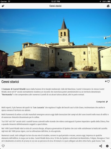 Qui troverai informazioni e notizie sulla storia di Castel Ritaldi, l’arte e la cultura, il contesto paesaggistico e territoriale, gli eventi e le manifestazioni. Castel Ritaldi offre tante manifestazioni legate alle tradizioni e ai prodotti tipici, che ti stimoleranno sicuramente a venirci a visitare. L’App offre anche le indicazioni necessarie per programmare la tua visita e ottenere un primo orientamento rispetto alle possibilità di accoglienza e ospitalità offerte dalle strutture turistiche.