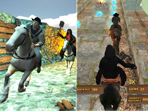 This is a lot like temple run... Wouldnt it be cool if we could tip the phone and the horse/rider will lean?? Like temple run! Plus I dont want to be a man who is being squashed by a hammer man, I want to be a girl with my own choice of horse color being squashed by a hammer man. Just try to make it kinda like temple run but make it extra AWESOME. Because horses are AWESOME